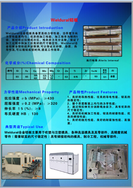 3. 卓越的熱傳導率。其熱傳導率比一般模具鋼高,故可節(jié)省模具在生產(chǎn)時的冷切時間50%,從而提高模具的生產(chǎn)效率。所以Alumold在注塑模、吹塑模、低壓模、橡膠模等不同模具行業(yè)80%的產(chǎn)品中有廣泛應(yīng)用。隨著市場的發(fā)展,目前在歐美市場超硬鋁已替代鋼做模。